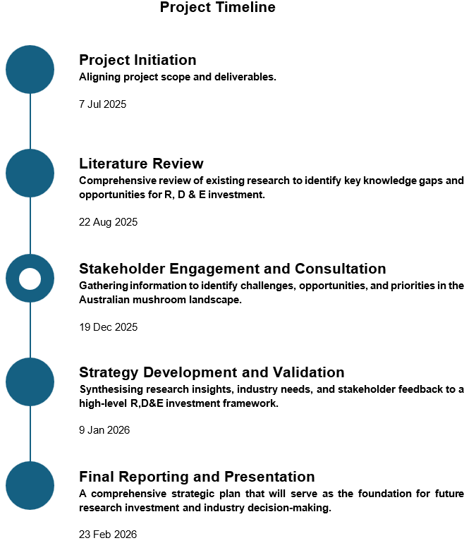 The MU24004 project aims to create a 5-10-year strategic plan to guide the Australian mushroom industry’s investments in health and nutrition research, development, and extension (R, D & E). This plan will guide research that enhances understanding of the nutritional benefits of mushrooms, support educational initiatives to positively influence consumer behaviour, align research efforts with industry priorities, and enable informed decision-making for future investments in the sector.